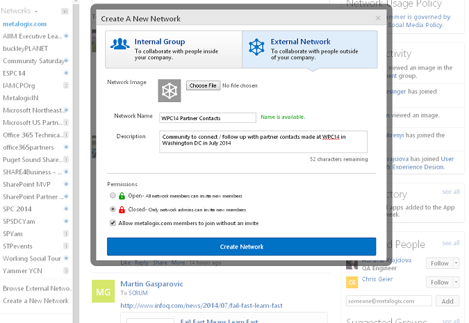 Another Microsoft product to add to the mix when it comes to delivering extranet capabilities is Yammer. Yammer is an Enterprise Social Network (ESN) platform that Microsoft acquired a few years ago, and is gradually becoming more and more tightly integrated with the rest of the Office365 product suite. It provides much better conversational functionality than SharePoint, but – being an ESN – does not provide anything like the same Web Content Management or Enterprise Content Management capability. It also falls way behind SharePoint in terms of personalisation and extensibility, but – in fairness – it’s not trying to compete with SharePoint: it’s a packaged product that you have very little control over, and does what it’s designed to do (i.e. social) very well. In terms of how it can be used to deliver an extranet, it is possible to create ‘external networks’ that act like sub-networks of an organisation’s main ESN. Third parties can then be invited by administrators or network members (depending on how you configure it) to join the external network via an email link.