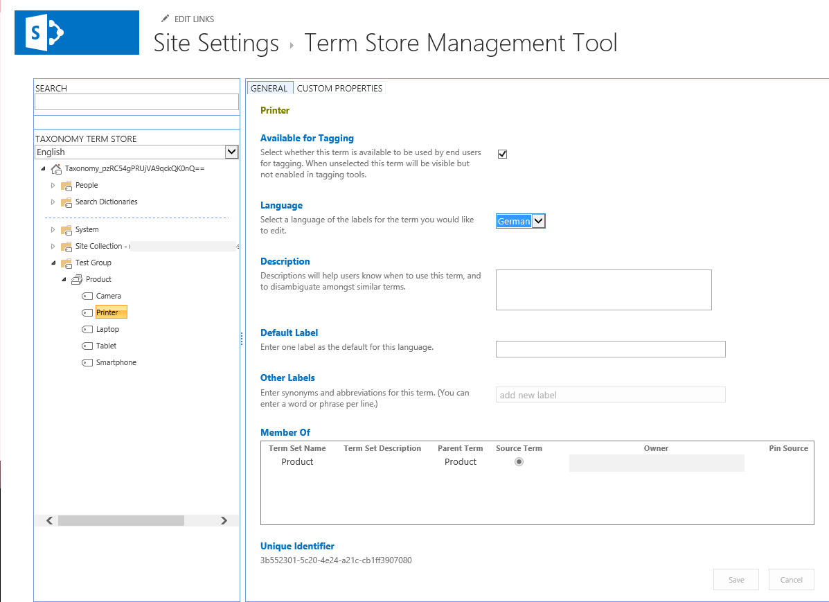 • SharePoint search results will only include the default label for terms, not the alternative labels you specify for other languages. This means you will need to create a custom refinement panel control if you want to utilise your labels in search.